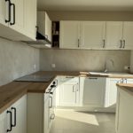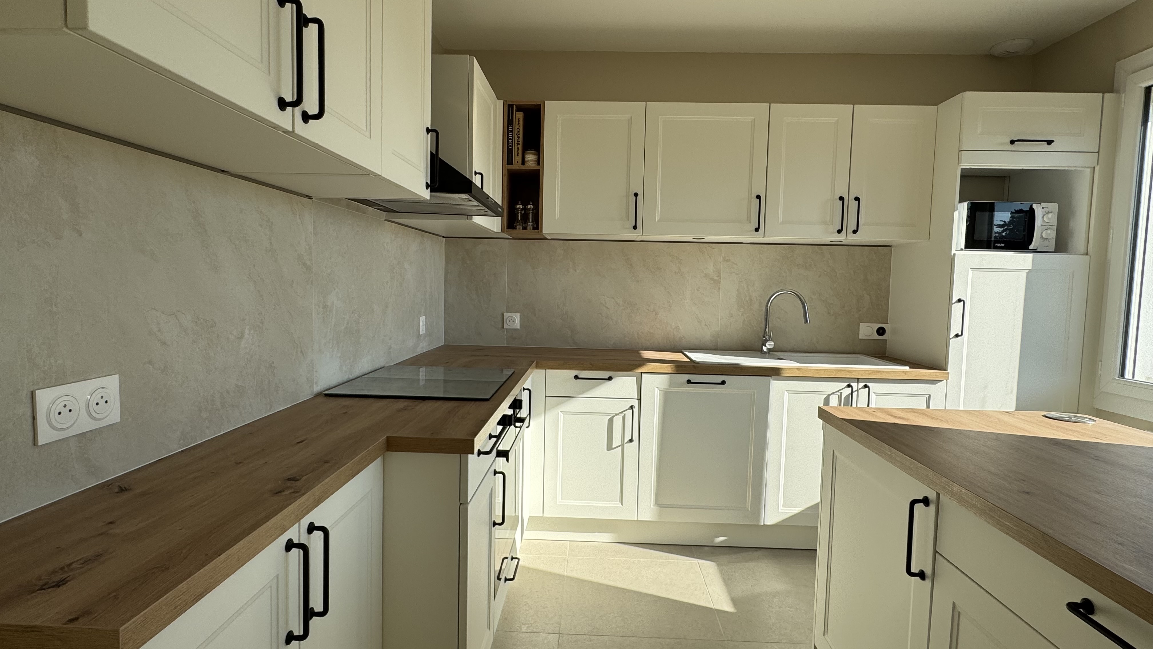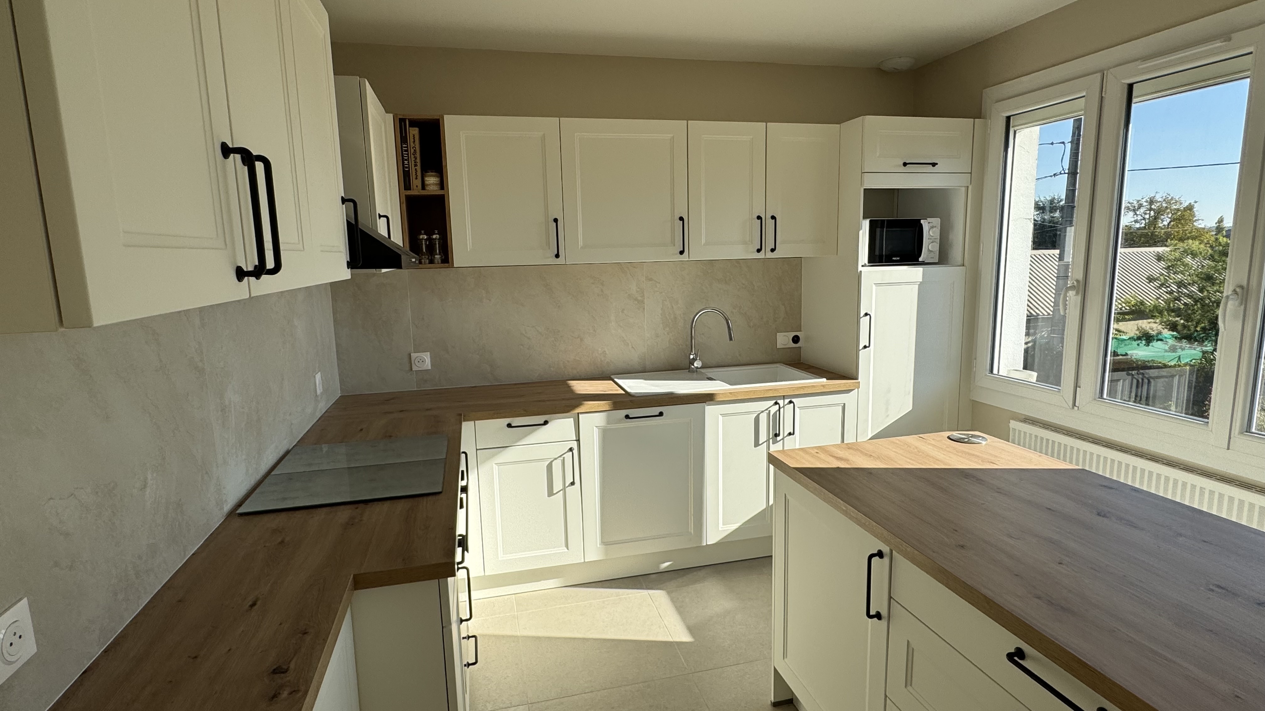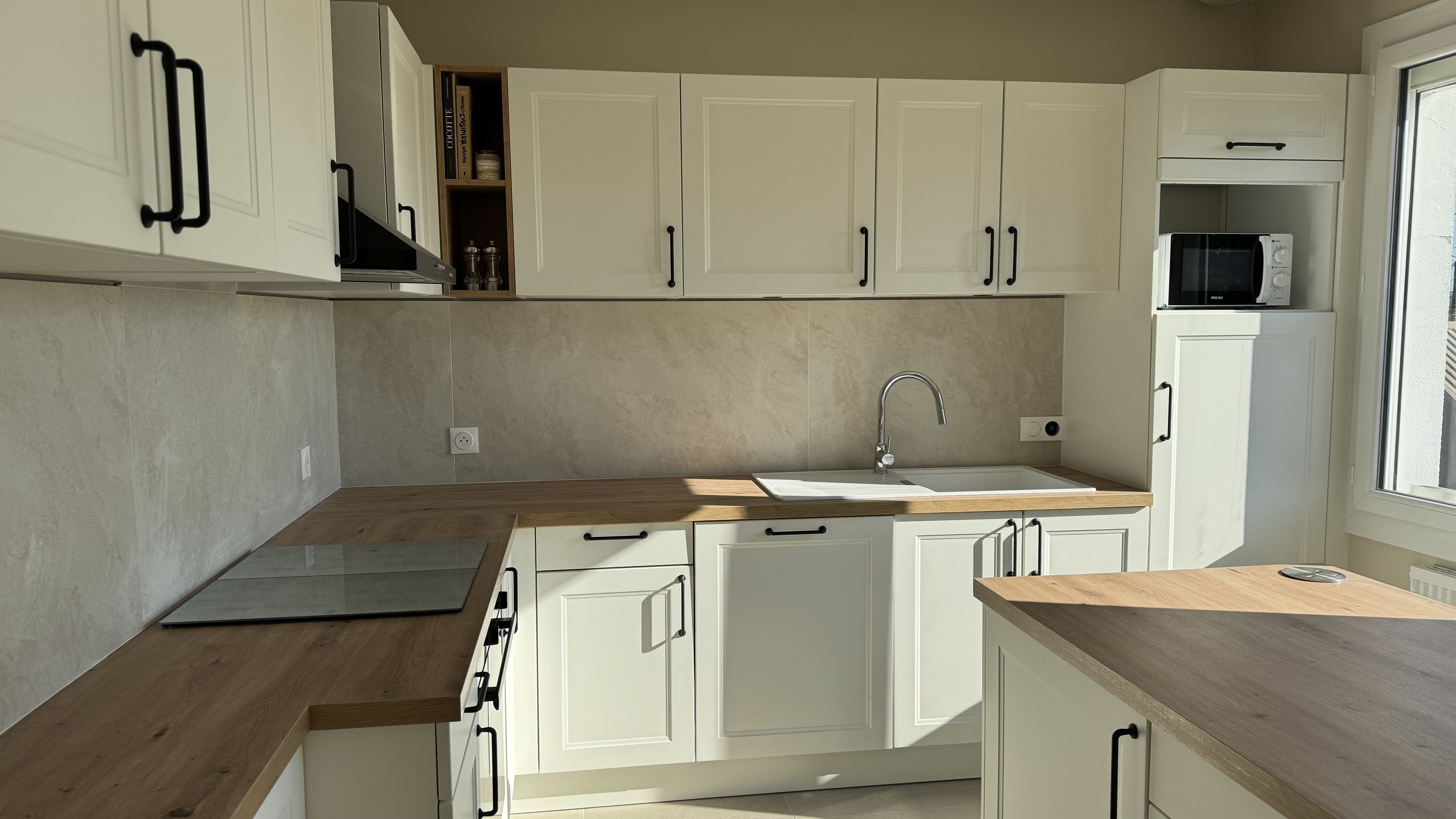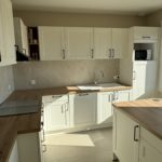 - Stratifié laqué BLANC POLAIRE / Plan de travail Chêne massif / Crédence Verre